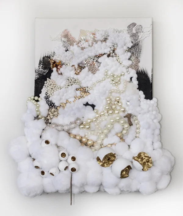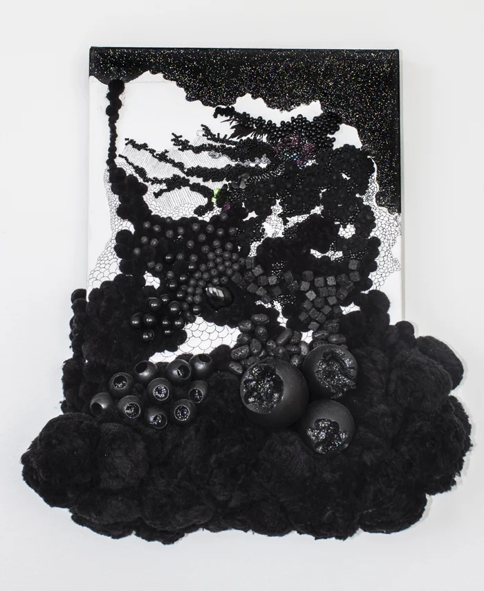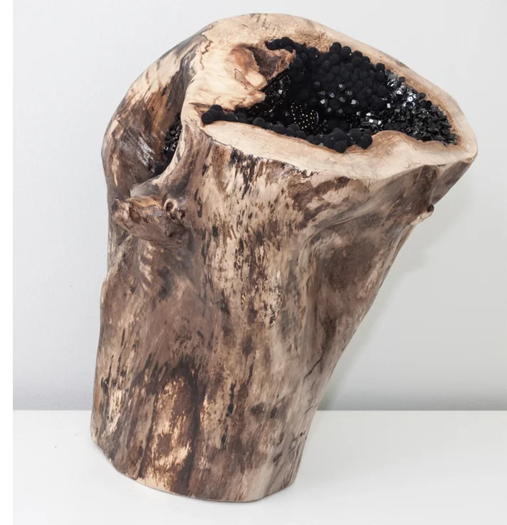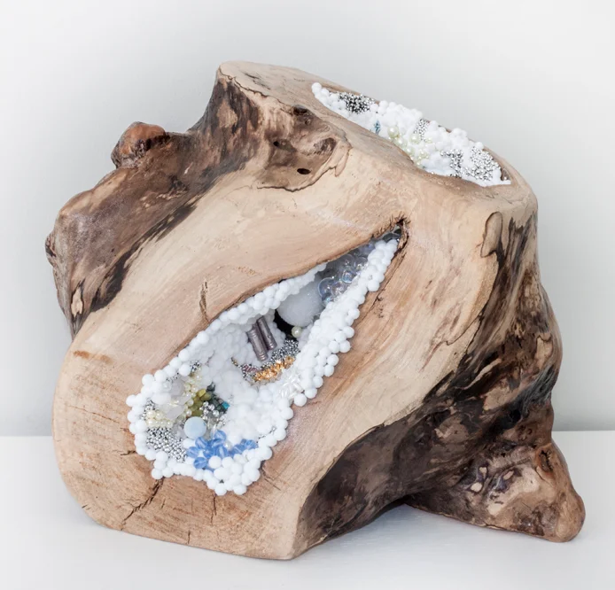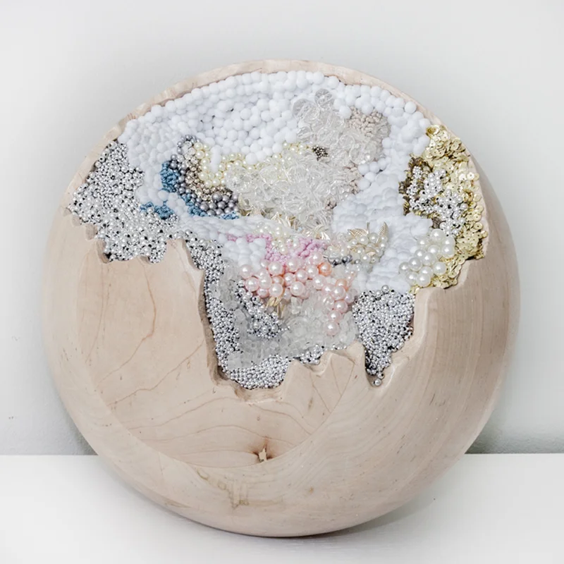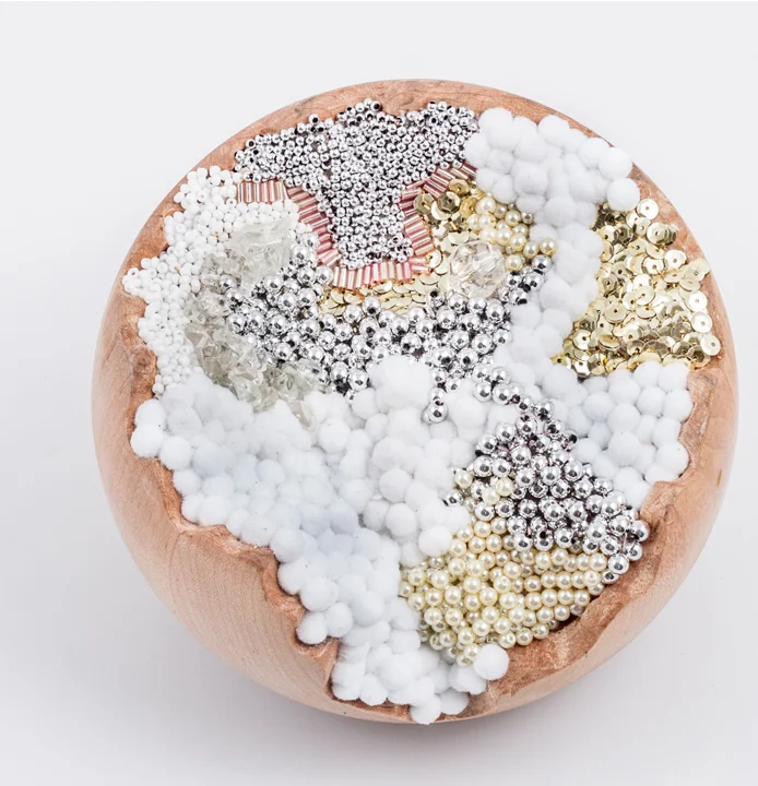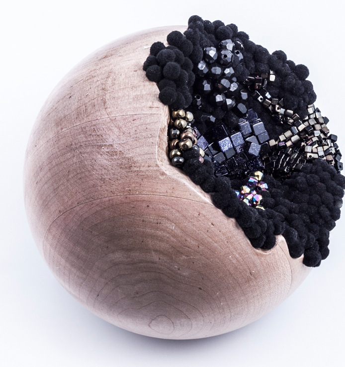 SAGAN DRUYAN 1, 2012, solid maple sphere carved and embedded with hand embroidered beads, pearls, sequins, and poms, 12 x 12 inches